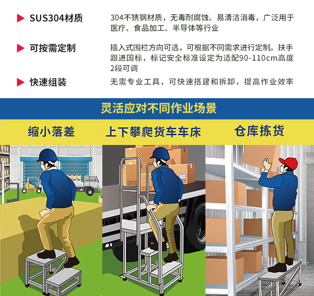 主体采用304不锈钢材质,无毒耐腐蚀,易清洁消毒。轻量且耐用,超宽天板,精密防滑花纹,防滑安全可承载较重设备和工具,确保作业时的安全与稳定,适合工业环境。