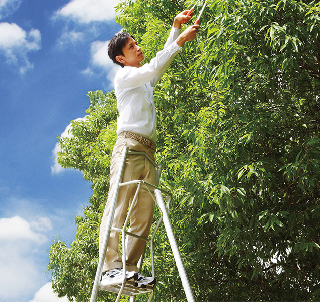 灵活利用三角形稳定性,充分发挥三角形稳固、坚定、耐压等特殊的力学特点。加上可调节高度的脚部,让梯子能轻松应对园林内的各种地形。利用高强度耐腐蚀铁链确保安全作业角度。钢钩搭配调节孔确保锁定调节伸缩梯脚方便应对不同高度作业。