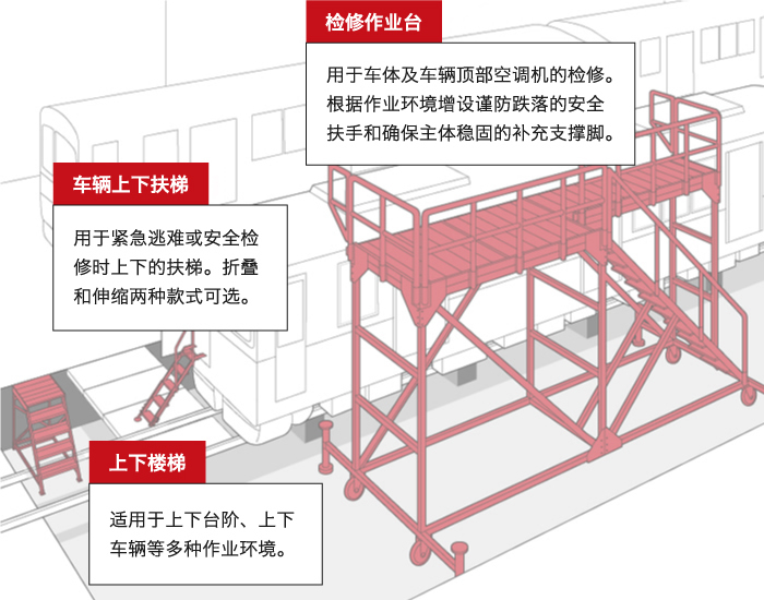为了铁道车辆的安全检修和车辆周边各种机材以及突发逃难情况等制作的多用途机材产品。