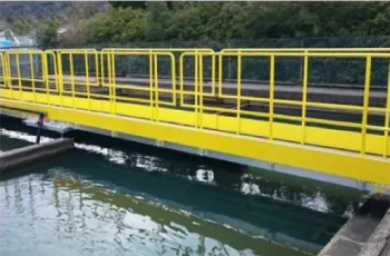 为了管理用于调查水质的水槽而制造的步廊。为起警示作用而采用黄色涂料的扶手。