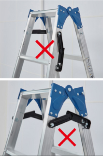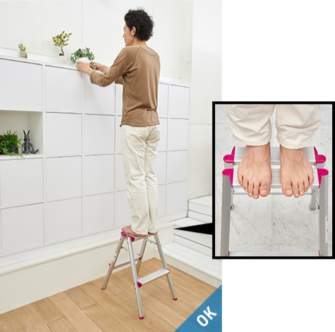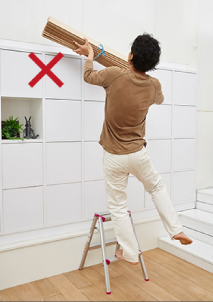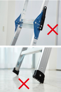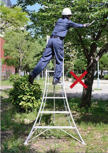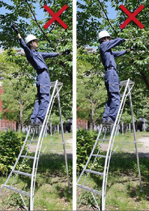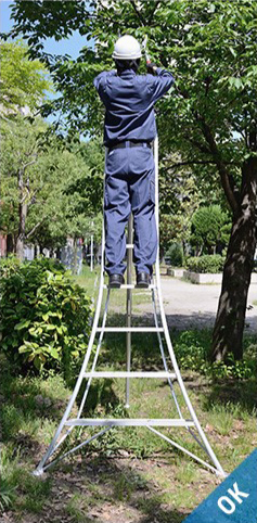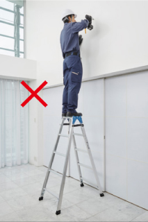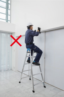 - 在三脚梯上进行作业时,请站在从天板开始数第四节(180cm以下的型号则为第三节)以下的踏板上,身体轻靠天板和上层踏板,在平稳的状态下操作。